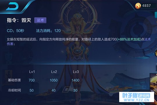 四技能:毁灭,女娲在短暂的延迟后,向指定方向释放纯净的能量,对路径上的敌人造成法术伤害。