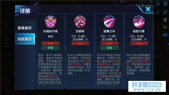 二技能-炫舞之华·轻剑:花木兰向指定方向投掷轻剑,对路径上的敌人造成伤害,并且轻剑会在终点持续旋转,对范围内的敌人造成持续伤害,并减少敌人移动速度。拾起轻剑会返还部分冷却时间。炫舞之华·重剑:花木兰向指定方向前进并连续造成四段物理伤害,每次造成伤害能将敌方击退,同时造成减速。