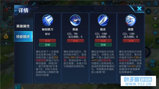 一技能-燕返:橘右京向后方跳跃,同时向前方挥刀,造成物理伤害。若命中敌方英雄,将大量减少该技能的冷却时间。
