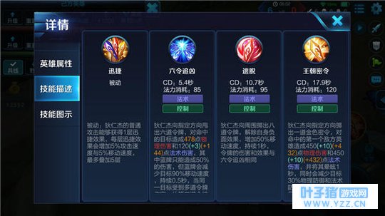 一技能-六令追凶:狄仁杰甩出六道令牌攻击(可触发普通攻击法球效果),对命中敌人造成物理伤害和法术伤害加成,蓝牌可对目标额外造成减速效果但是伤害会减半,若同一目标受到多道令牌的伤害,则第二道令牌开始伤害将会衰减。被动:第三次普通攻击将会随机强化为一张红牌或者蓝牌。