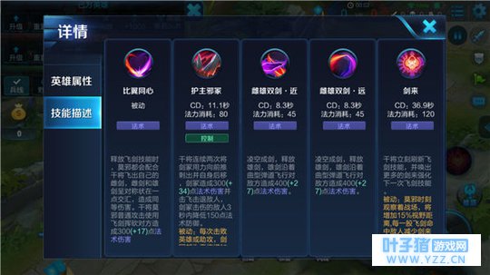 三技能-雌雄双剑·远:干将莫邪释放雌剑,会沿着曲型弹道飞行,对命中目标造成法术伤害。三技能的距离会比二技能远,但造成伤害是一样的。