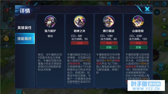 牛魔对指定方向横劈,对范围内的敌人物理伤害,并持续一段时间减少物功力和法功力,强化下一次普攻,附带额外伤害,这是牛魔的AOE技能伤害高,控制力强,团队时间人群中释放会有很好的效果。