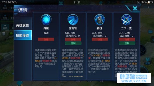 宫本武藏的一技能不仅有伤害,并且可以阻挡任何有敌方飞行物。而宫本武藏的大招,不仅有伤害,之后还有一个状态,使得宫本武藏放大招前后判若两人。
