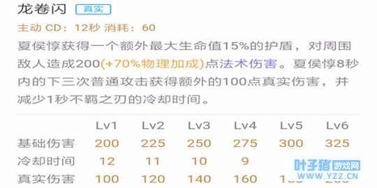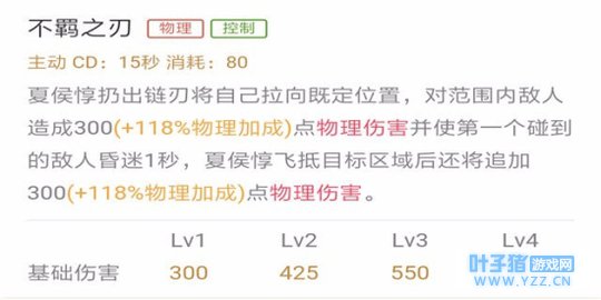 整体分析:单体强控技能,命中敌人后会造成晕眩控制和伤害,随后夏侯惇会跟进造成二次伤害。该技能最大的优势莫过于超短的冷却时间了,而且通过二技能的普攻还能减少,这让他有着很高的控制效率,在团战中更是可以打出多次,可以很好弥补控制范围较小和目标单一的问题。