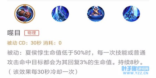 整体分析:在低于半血及以下时,该技能可以自动触发,让夏侯惇的每次技能或普攻都能为自己回复血量;这个技能让夏侯惇有很强的持续作战能力,即便是吃下敌军的一整套技能,他后续也有反打的实力;另外该技能虽然是内置CD,但在触发时身体会有蓝色的特效作为提示,而且持续时间长,可以让召唤师们有充足的时间来回血。