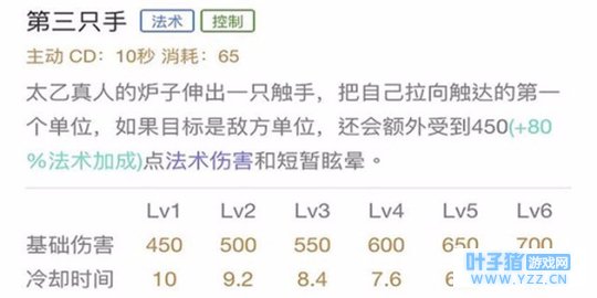 整体解析:“第三只手”可以依靠拉中敌人来进行位移,可以拉的对象有兵线、英雄和野怪,如果没有拉中敌人,是不能进行位移的,所以技能的操作性比较高,在使用二技能的时候,先预判敌人的走位,可以达到更高的技能命中率。如果拉中敌人还能有一个很短暂的控制作用,二技能主要是为一技能做突进作用,更好的让太乙真人贴近敌人,打出一技能的伤害和控制效果。
