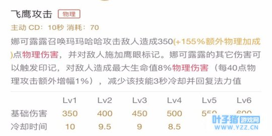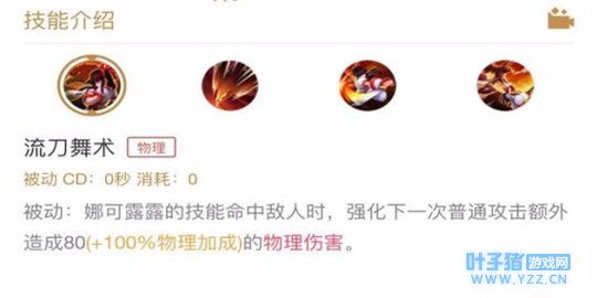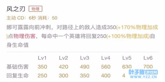 技能解析:娜可露露向前冲刺,对路径上的敌人造成物理伤害,每命中一个英雄将回复一定自身生命值。