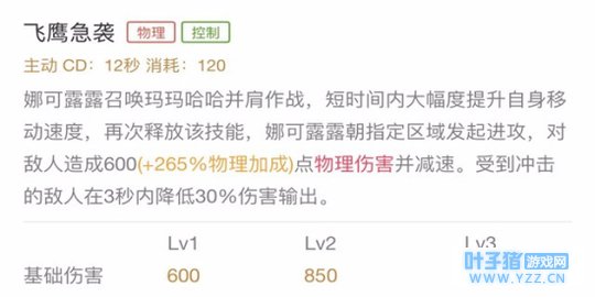 技能解析:娜可露露开启大招后,短时间内大幅度提升自身移动速度,再次释放该技能,朝指定区域发起进攻,对敌人造成物理伤害并减速。受到冲击的敌人在3秒内降低30%伤害输出。