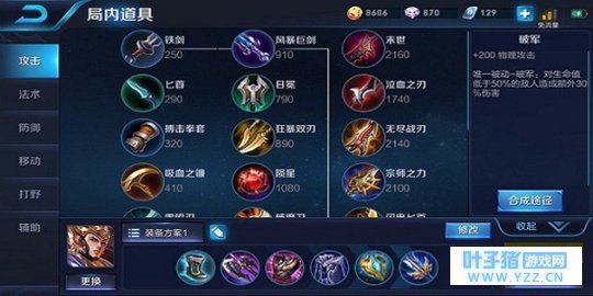 破军这件装备提供了超高的物理攻击加成,并且被动的效果配合杨戬1技能的斩杀效果可以更容易刷新1技能达到收割战场的目的。