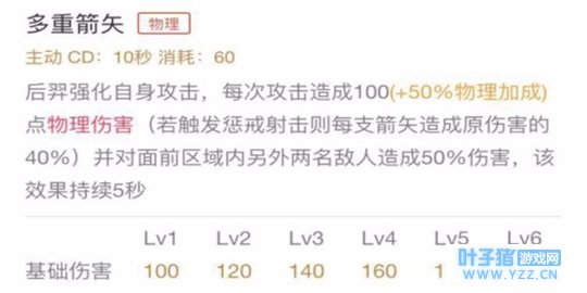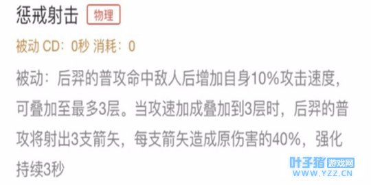 整体分析: 被动技能可以让后羿在普攻命中后增加攻速,可叠加数层,有上限。叠满后,三秒内普攻将会射出三支箭矢,每支箭矢的伤害比原伤害低。被动技能让后羿前期就可以快速叠加攻速,普攻打出范围攻击可以增加后羿的推线速度。打团时,如果敌方站位比较集中,可以打出大量伤害。