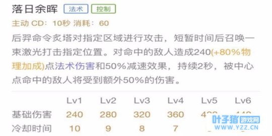 一技能可以让后羿的普攻附加额外的物理伤害,同时对攻击范围内的另外两名敌人造成一定的伤害。一技能同样增强了后羿的前期推线能力,同时普攻伤害的增加也让后羿在对线期可以快速消耗敌方英雄的血量,打团时一技能搭配上被动效果,可以打出非常强的范围输出。