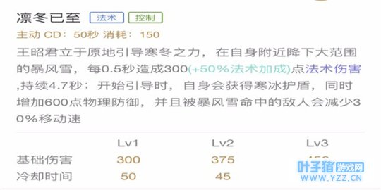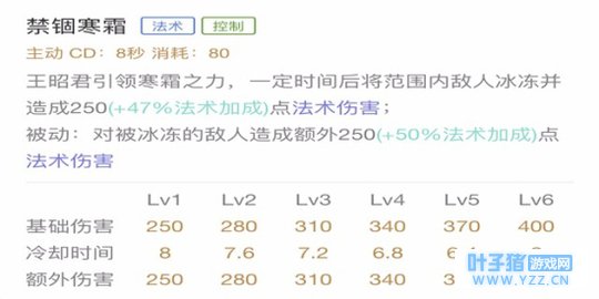 数据分析:虽然这个技能的基础伤害比二技能多,但是这个技能并不是王昭君核心技能,相比较二技能的冰冻而言,这个技能要稍微逊色一些,因此在加点方面推荐出门加点,然后次加。