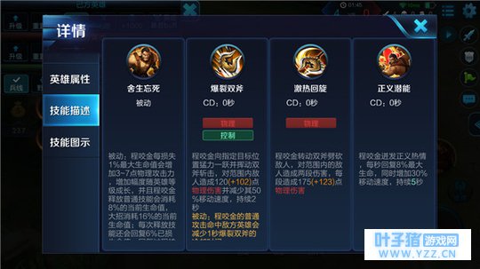被动-舍生忘死:程咬金每损失一定生命值后,都会增加自身攻击力,并且每次释放技能时会消耗自身生命值,每次释放技能时,程咬金还将获得短时的生命值回复效果。