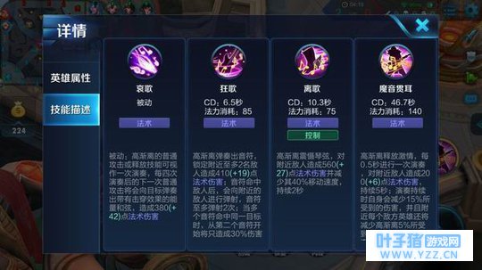 狂歌:高渐离的一技能使用后能够弹奏出音符,对附近至多两名英雄造成法术伤害,若该技能命中同一目标,则从第二个音符开始伤害降低。该技能的冷却时间较短,是前期主要的输出技能。