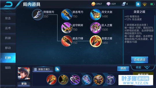 解析:前期开局根据自己的风格和敌方阵容选择打野装备。如果敌方大多为后期英雄,可以选择贪婪之刃提高前期作战能力带动节奏。反之选择巨人之握平稳的发育到后期。影忍之足能够为娜可露露提供一定的护甲,增加娜可露露的生存能力。