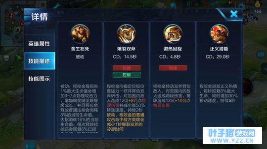 爆裂双斧:程咬金的一技能,使用后向指定位置跳跃,对命中的敌人造成高额物理伤害和减速效果,该技能的被动效果是程咬金的普攻将减少该技能的CD。此技能能够有效地牵制敌人,并且可以用来穿墙逃跑。