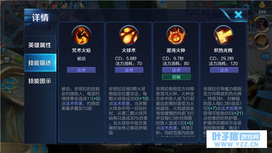 被动技能——咒术火焰:被动技能是安琪拉打出爆发伤害的关键所在,安琪拉的技能伤害都会叠加灼烧伤害,使得安琪拉在持续攻击敌人时能打出巨额的输出,达到秒杀的效果。