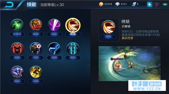项羽可以选择携带召唤师技能终结,在遇到残血的敌人之后,利用终结可以立即将敌人击杀,团战时终结的效果尤为给力,可以迅速的击杀敌方残血英雄,不给敌方英雄逃脱的机会。