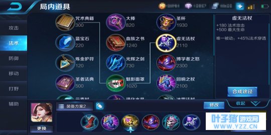 最后一件装备选择虚无法杖,除去需要的法术攻击以及更多的抗伤能力之外,被动的百分比法术穿透让武则天打坦能力更加优秀,能抵制下魔女斗篷与不死鸟之眼的法术防御效果。