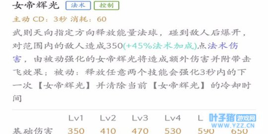 武则天主要输出技能,向前方施放法球碰到敌人爆开造成范围伤害,被动为施放任意两个技能下次一技能会强化(3秒强化施放时间,且会清除当前一技能冷却)