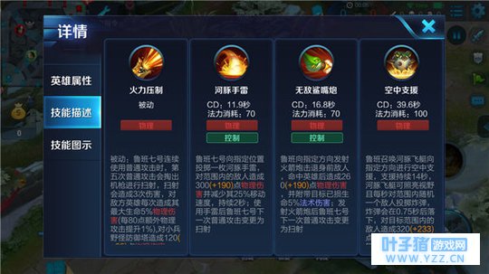 鲁班七号施放技能,召唤河豚飞艇进行空中支援,持续较长的时间,河豚飞艇可以照亮视野并每秒对范围内随机一个敌人投掷炸弹,炸弹可以对目标范围内敌人造成物理伤害,并使得鲁班七号下一次普攻变为扫射。实战中此技能可以作为鲁班七号的先手开团技能,向团战中心施放该技能可以达到更好的伤害效果。