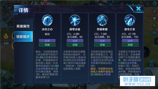 被动技能:冰封之心,王昭君在脱离战场后会获得抵免伤害的护盾,如果护盾被敌人击破会给敌人造成法术伤害和减速。