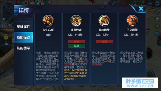 程咬金向指定目标位置发起跳跃并挥砍双斧,对范围敌人造成伤害和减速,持续数秒。此技能是程咬金的突进技能,让其拥有较强的先手和反手能力,对战中能利用技能的减速效果更好的留住敌人,配合队友造成击杀。在关键时候此技能也可以用来翻墙、撤退等,有较多用处。另外,程咬金的普通攻击命中敌方英雄时还会减少此技能的冷却时间,因此在对战中此技能的冷却时间是相对较短的,让程咬金可进可退更加灵活。