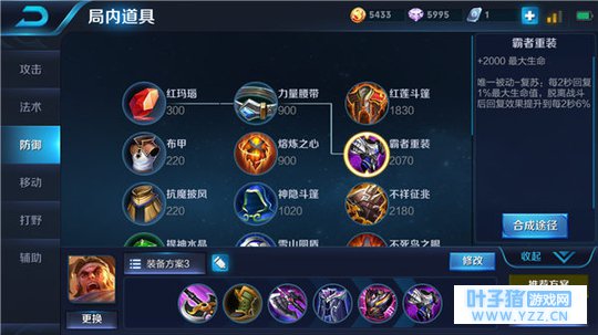 后期苏烈可以选择将巡守利斧换为极寒风暴,再加上暴烈之甲和霸者重装,就形成一套集回血、减速、高物理防御于一体的防御装备。这套装备的优点是回血能力强,依靠霸者重装的效果,苏烈脱离战场后不久又能重返团战;牵制能力强,极寒风暴提供的范围减速和物理防御能让苏烈面对输出英雄时全然不惧;反击能力强,依托暴烈之甲的伤害增幅,在团战尾声苏烈可借此反杀对手。