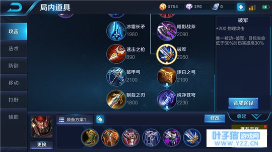 装备推荐:影忍之足+红莲斗篷+反伤刺甲+魔女斗篷+霸者重装+破军