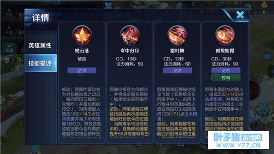 一技能——岑中归月:一技能既可以作为位移技能,也能当做增益技能。有纸伞时,施放一技能会向前突进,再次施放会回到原地,战场用法和李白的一技能类似;没有纸伞时,施放此技能会额外增加移动速度和攻击速度,提升输出和机动性。