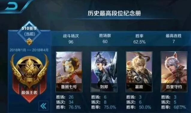 每一位英雄的胜率都非常的可怕,特别是鲁班七号34场胜率高达76.5%。整个赛季只玩了96场就上了最强王者,该玩家在S9赛季也是王者,可以确定他是从钻石开始玩的。