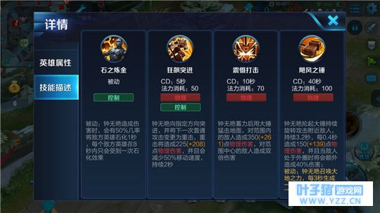 飓风之锤(三技能):钟无艳抡起大锤持续旋转攻击附近敌人,持续数秒,造成一定的物理伤害,并且当敌方英雄处于外圈时将额外造成伤害;被动:钟无艳召唤大地之力,每数秒生成一个持续存在的岩土护盾,岩土护盾可抵挡一定的伤害。