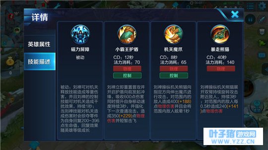 机关魔爪(二技能):刘禅操纵机关熊猫向指定方向伸出魔爪进行攻击,对范围内的敌人造成物理伤害并将其眩晕,是刘禅的主要控制技能。该技能基本没有施法前摇,因此命中率较高,能很好的在团战中造成AOE控制效果。