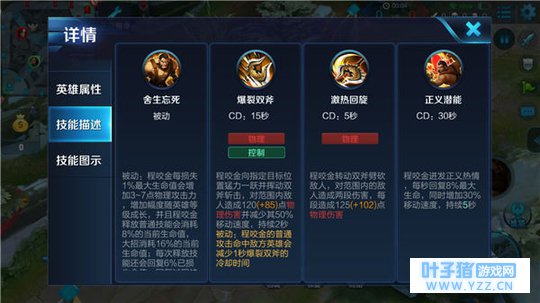 爆裂双斧(一技能):程咬金向指定目标位置猛力一跃并挥动双斧斩击,对范围内敌人造成物理伤害并将其减速;被动:程咬金的普通攻击命中敌方英雄会减少1秒爆裂双斧的冷却时间。