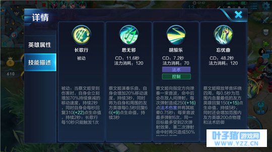 一技能:蔡文姬弹奏乐曲增加自身的移动速度,并且给范围内的友军恢复大量的生命值,蔡文姬本人也能恢复大量生命值。