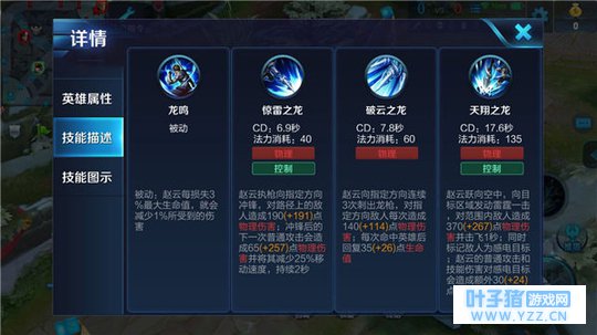 赵云每损失一定比例的最大生命值将获得额外比例的免伤效果,该技能提升了赵云的丝血反杀能力,同时也提升了他的生存能力。