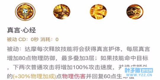 达摩的被动让达摩每一次使用技能都可以获得80物理防御的加强,最高叠加三层,也就是240点物理防御的加强。这个加强让达摩不出肉装也不会像脆皮一样被轻松击杀,在正面强打方面更有优势。技能的每一次命中敌人可以提高达摩的攻击速度并获得恢复血量的能力,所以达摩应该技能保证技能的命中率。拳拳到肉的达摩,对敌人威胁更加巨大。