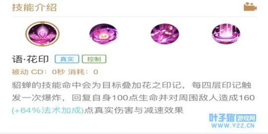 整体分析:这个技能是一个具有真实伤害的技能,一个不可或缺的输出技能,其真实伤害对梦奇、张飞之类利用护盾抬高血量的英雄有奇效。在团战中,一旦我们抓住了敌人之间距离非常近的机会,我们就可以利用被动减速敌人,同时被 动一旦触发并且命中,也可以再叠加一层被动并且回复自身血量,所以被动是团战中貂蝉续航和输出的核心技能。