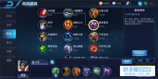 第六件选择霸者重装,提高大量的最大生命,并提供项羽一个很强的生命回复能力,脱战后回血很快,减少项羽中后期回城次数。