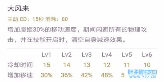 数值分析:虞姬的二技能冷却时间较长,一般一波团战只能使用一次,在关键时刻保命,而且升级之后加成效果并不明显,所以推荐副加。
