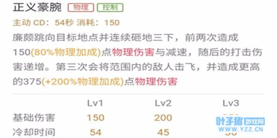 廉颇向指定方向跳跃,造成范围伤害,伤害分三段,前两段造成减速效果,第三段伤害更高,且造成击飞效果。