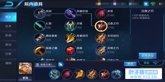 泣血之刃属性为100点物理攻击,25%物理吸血,让后羿站桩输出时能凭借高吸血能力及时回起血量继续打出伤害。(敌方回复能力强,有貂蝉,蔡文姬等英雄,选择制裁之刃限制敌方回复效果)