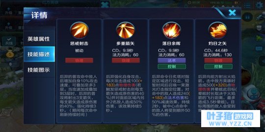 三技能没有改变,向前方射出火焰箭击中敌人将其晕眩造成伤害(晕眩时间由技能飞行距离决定),目标周围敌人会受到爆炸伤害。此技能让后羿拥有远程开团支援的能力,突如其来的飞行控制让敌人猝不及防,需要熟练练习对技能施放有一定的预判,百发百中的远程控制才是一名合格后羿的职责。