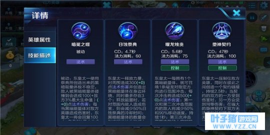 后期:后期的东皇有两个作用,进则想开团以大招困敌方核心输出位并将其秒杀,从而形成以多打少的局面;退则以大招困敌方偷袭的刺客英雄,保护自家输出位,以此奠定团战优势。
