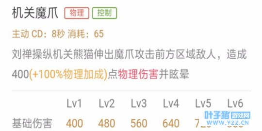 刘禅操纵机关熊猫伸出魔爪进行攻击,对范围内的敌人造成伤害并且会将范围内敌人眩晕。