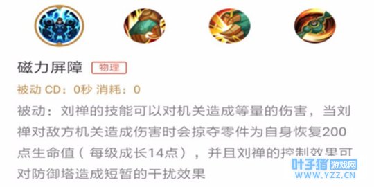 刘禅可对机关释放技能造成等量的伤害,并且刘禅的控制技能可对机关造成干扰效果,当刘禅技能对机关造成还伤害时会掠夺零件为自身回复生命。