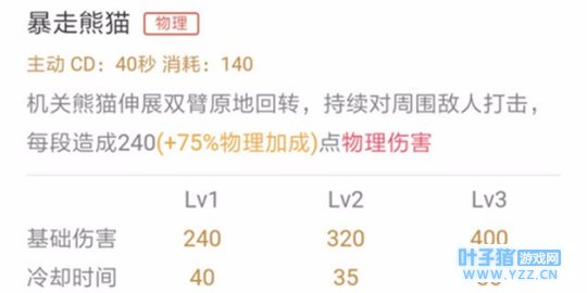 解析:该技能优点是对敌方英雄持续伤害高,并且攻击范围广,缺点是cd时间长,法力消耗多。该技能一般多配合小霸王护盾或者机关魔爪打出一定的控制效果后再释放,这样会使得暴走熊猫打出更多的持续伤害。同时收割时,此技能也有非常理想的效果。也可以通过该技能的多段伤害来攻击防御塔从而恢复血量。