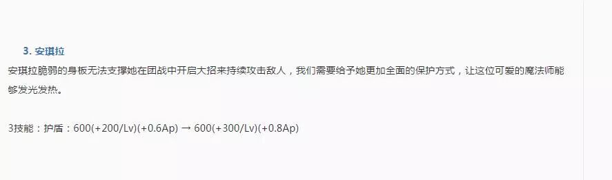 安琪拉的基础护盾值:以前是600/800/1000,当前版本变成了600/900/1200!法术加成60变成了80.