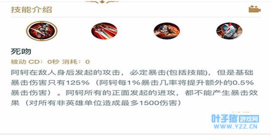 整体分析:这个被动技能是阿轲的技能特性根本,从背后必定暴击的技能特性注定她是一个必须要有足够暴击效果才能打出伤害的英雄。