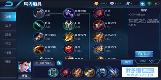 装备推荐:追击刀锋+急速战靴+无尽战刃+吸血之镰+宗师之力+破甲弓。孙悟空选择打野路线发育可以更加迅速,装备成型较早,可以在前期就打开局面,所以选择追击刀锋,提高打野效率,增加攻速,为大招触发印记伤害做准备。后期吸血之镰可以看情况选择合成泣血之刃或者制裁之刃。